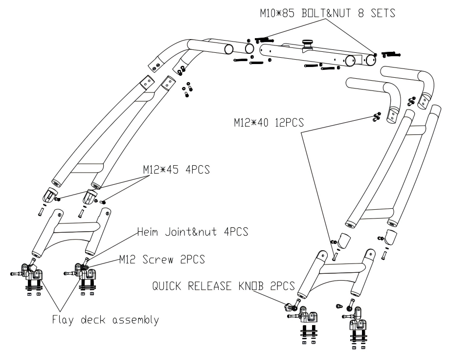 Re-assemble the tower top onto the base bars. Drill through the predrilled holes in the center section from each side with size 10 drill bit and install bolts and cap nuts. Please note that you need to drilling holes on the Top section after you confirm the exact measure it can fit on your boat and tighten with M10 x 85 bolts and nuts.One person will still be stabilizing the tower through this step. Tighten all hardware for completion of tower installation.